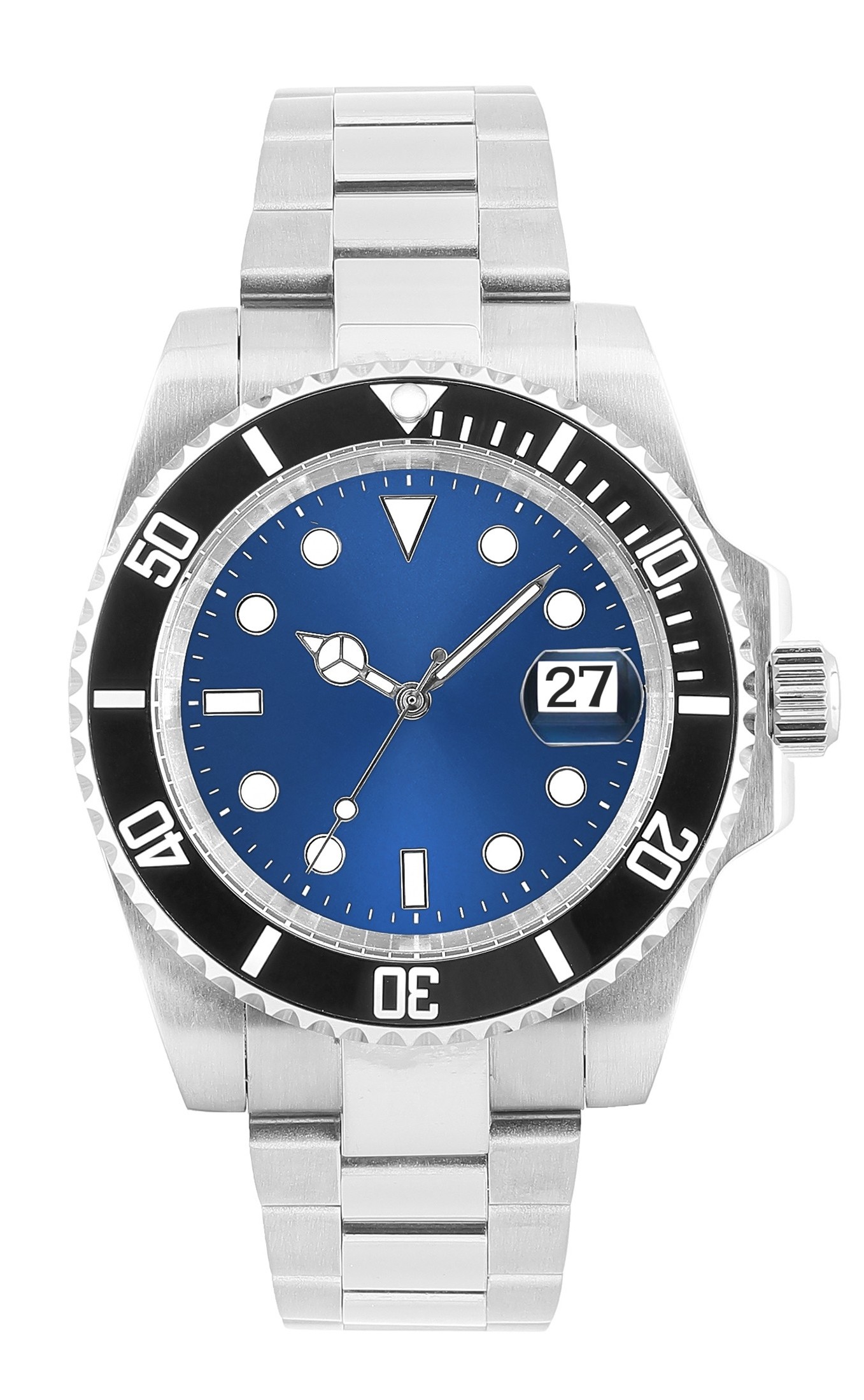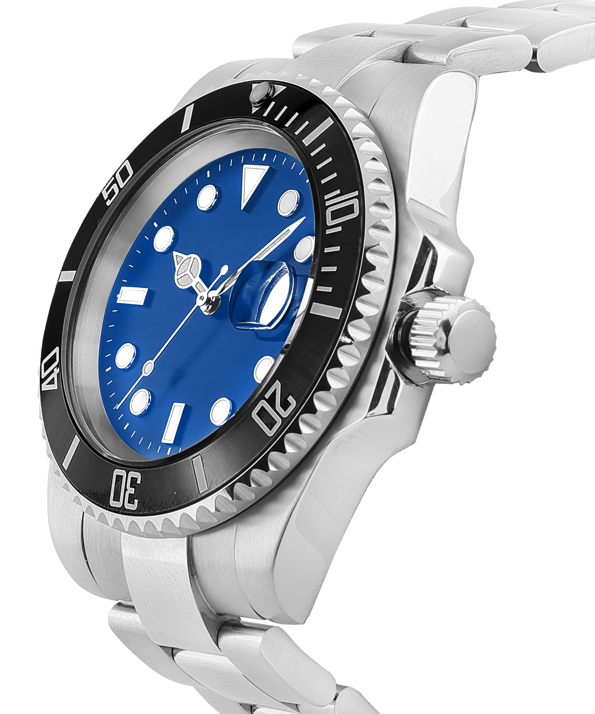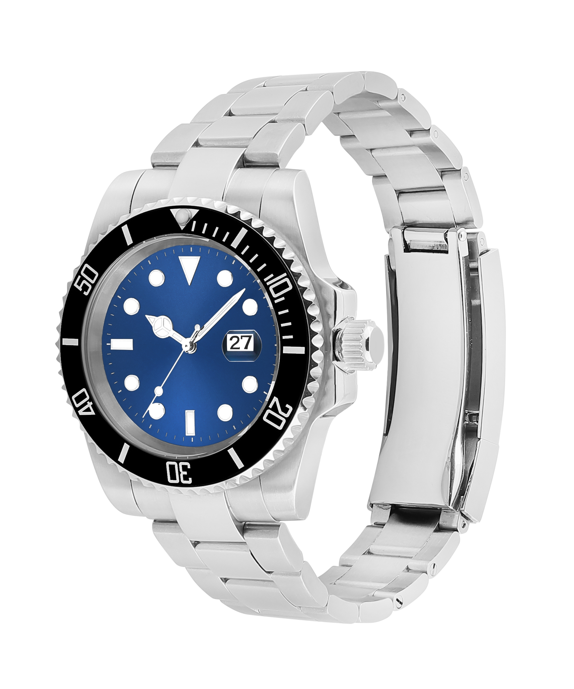 - Black Rotating Bezel – Classic dive-watch styling, bold contrast against the blue dial.