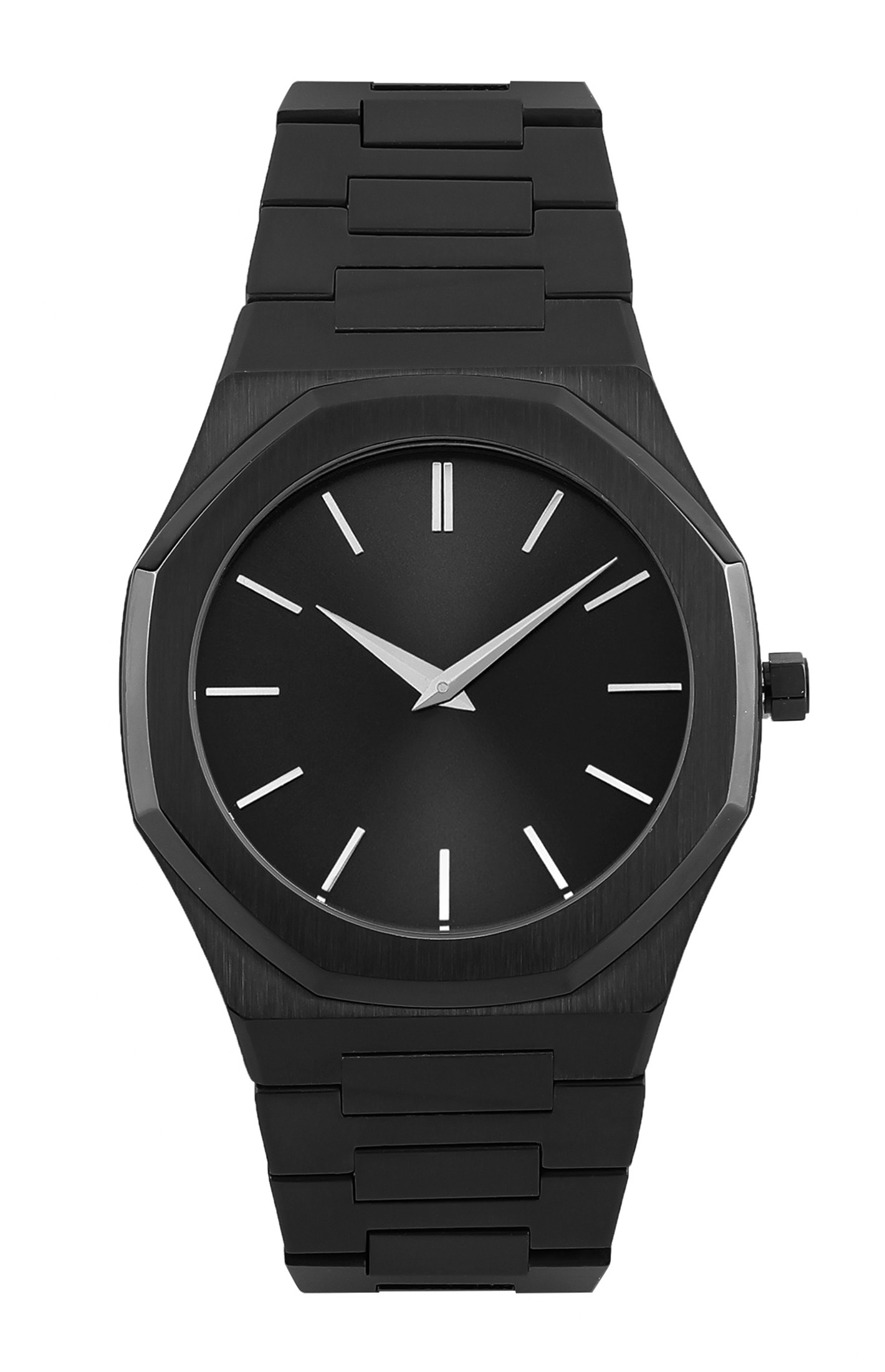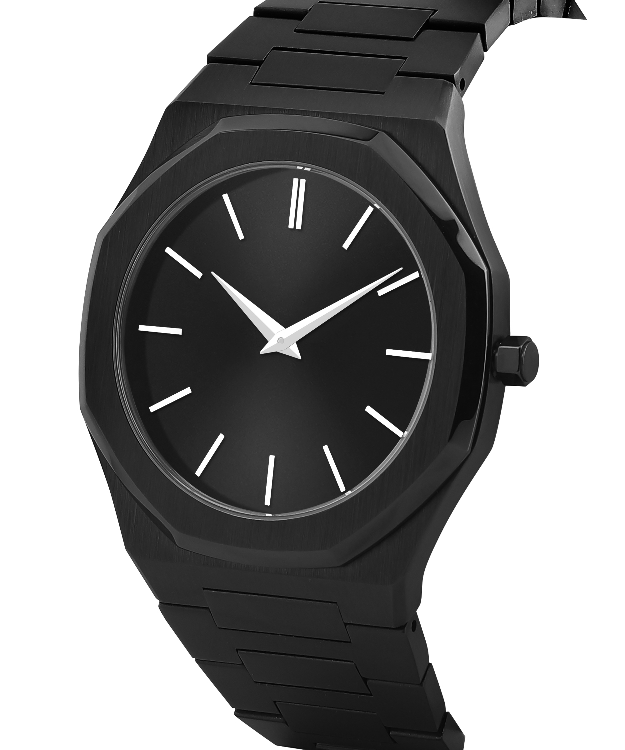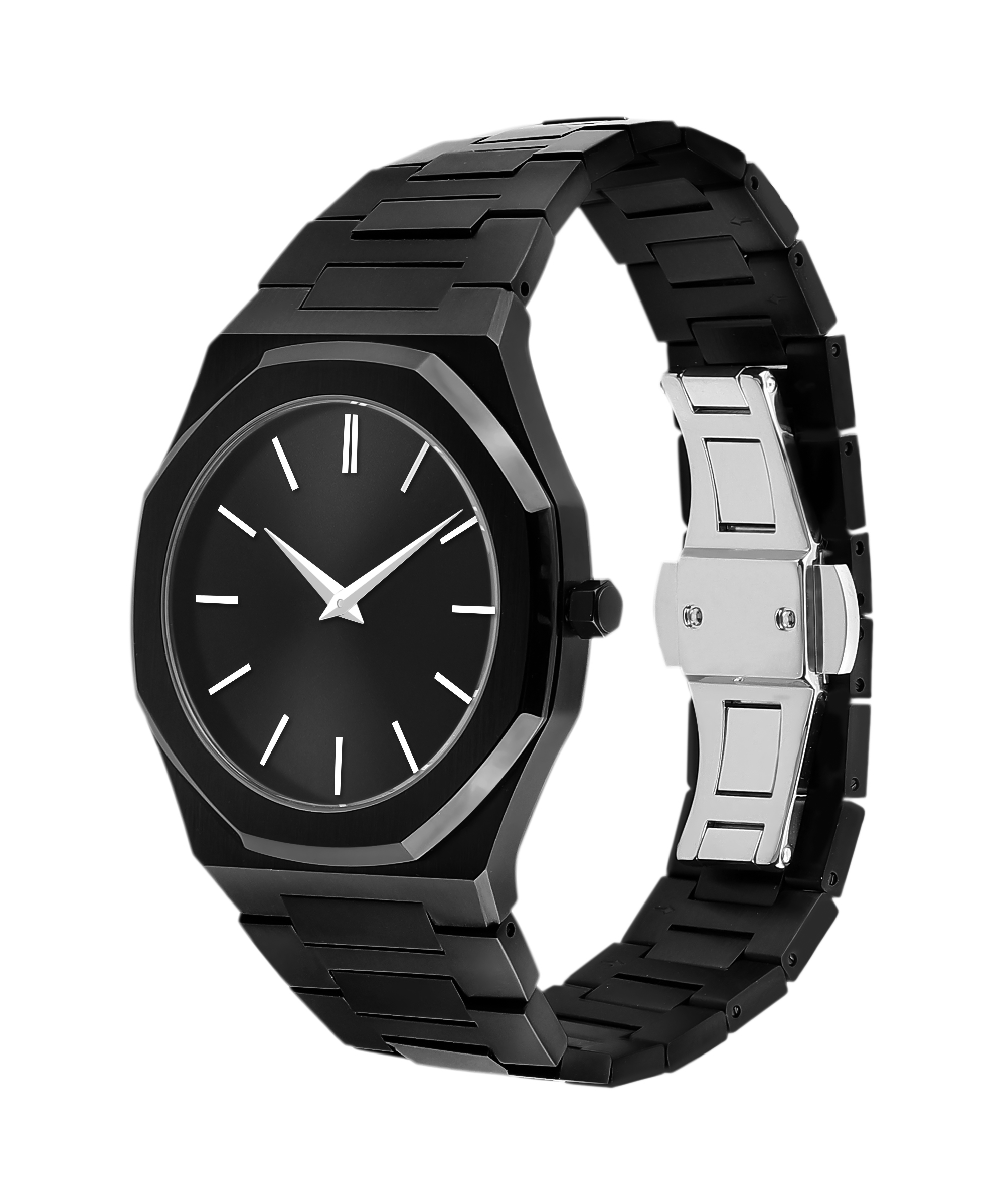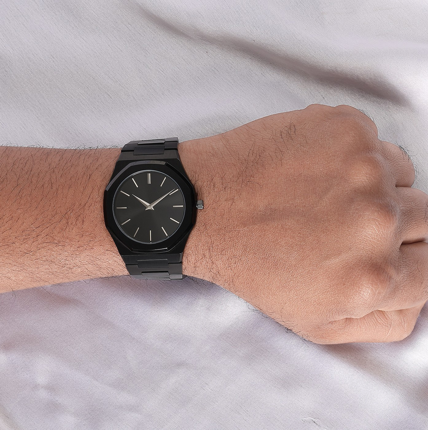 Personalized Sleek Minimalist Watch – Cosmic Black Dial, Black Steel Strap