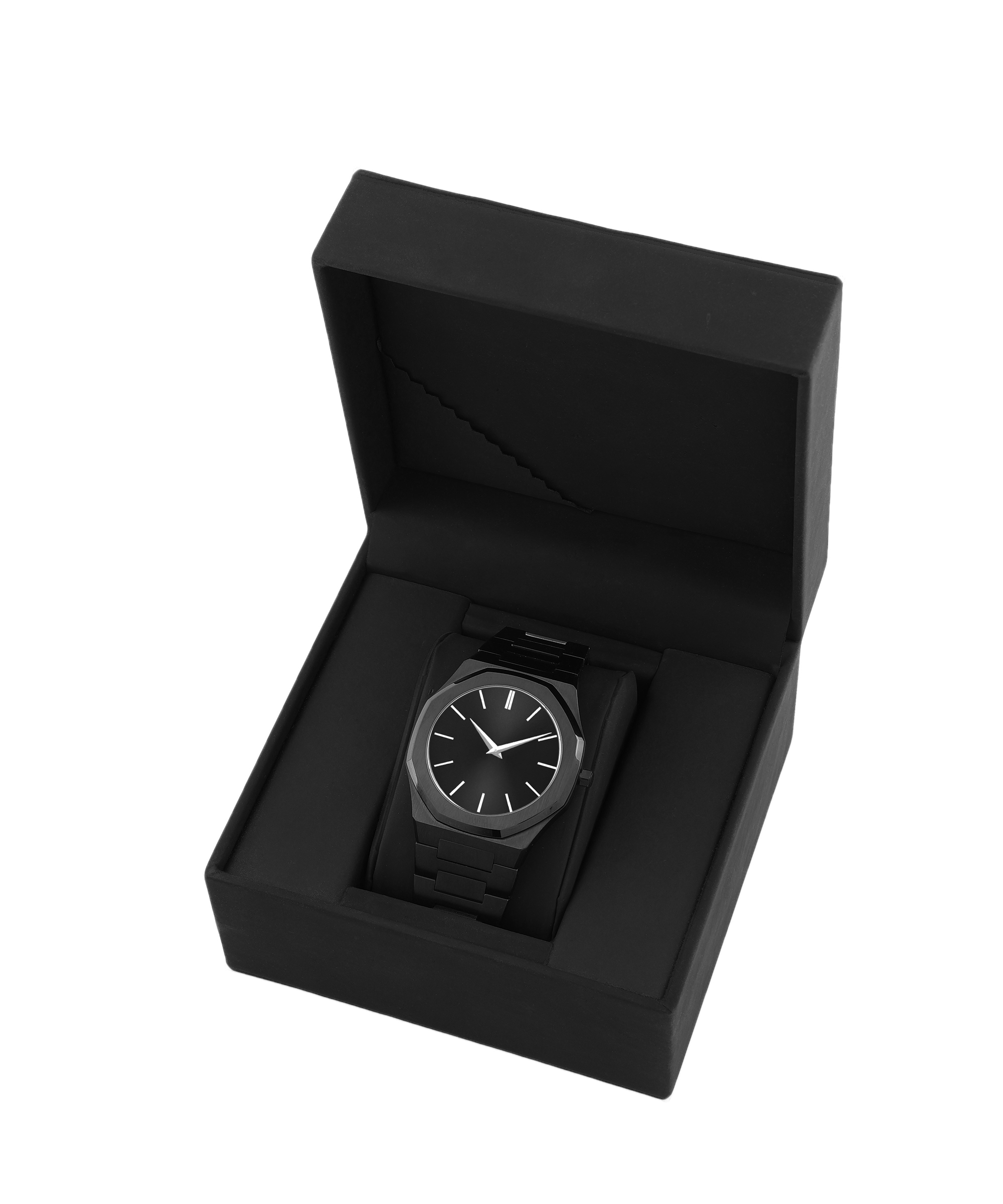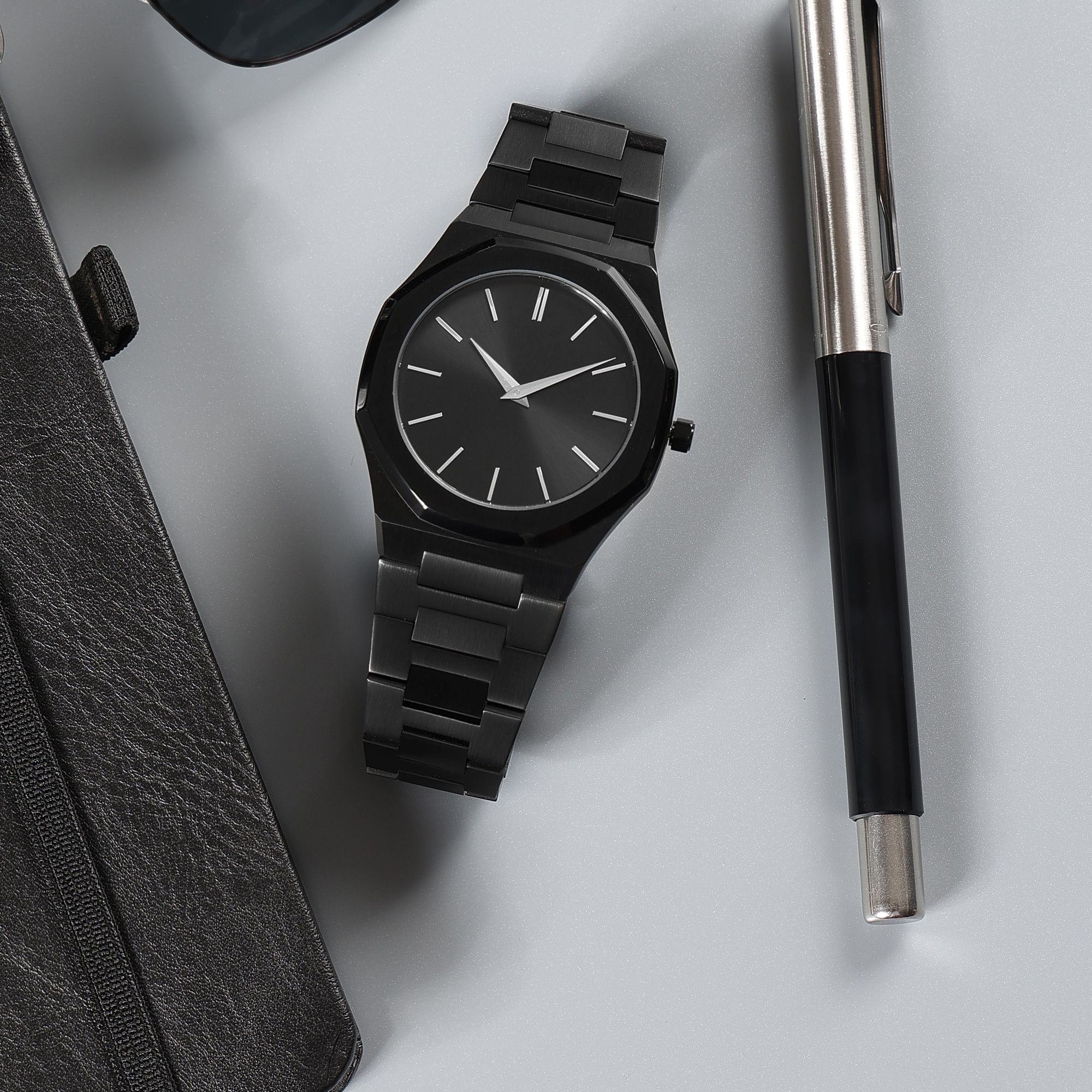 - Brushed Black Stainless Steel Strap – Smooth and durable with a matte finish that complements the all-black design.